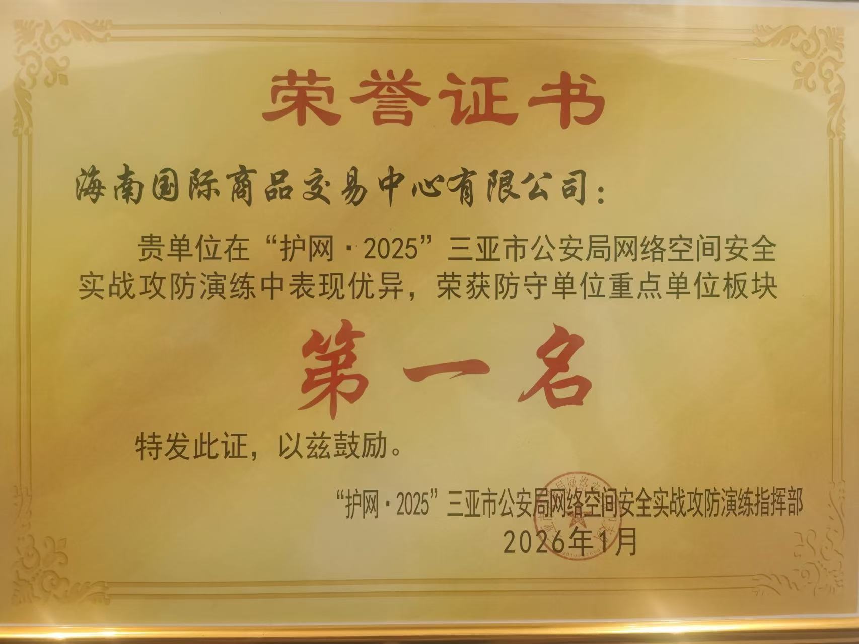 1月29日,由三亚市公安局牵头组织的“护网·2025”网络空间安全实战攻防演练圆满结束,海南国际商品交易中心(以下简称“海商所”)凭借严密的防护部署、高效的应急处置与过硬的专业能力脱颖而出,以优异总成绩斩获防守队第一名。